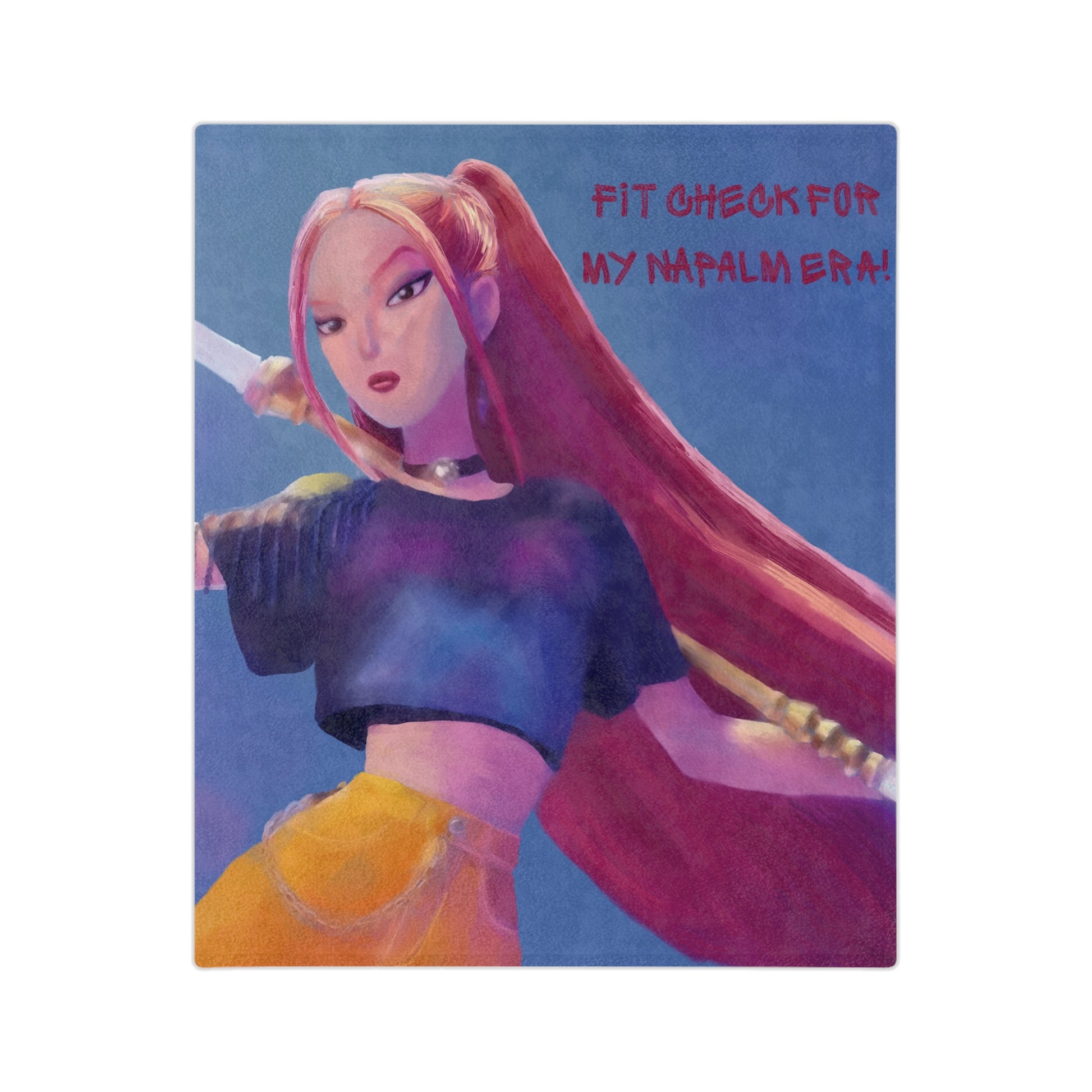 Wrap yourself in cozy comfort and fearless energy with this ultra-soft velveteen microfiber blanket. Its luxurious texture invites you to snuggle up and unwind after a long day, while the vivid artwork — hand-painted by Chevi — captures the fiery confidence of Mira: Napalm Era, inspired by bold K-pop demon hunter Mira.